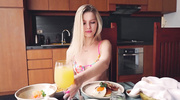 Молодая блондинка решила, что завтрак должен быть максимально горячим и богатым белком, устроив развратный сеанс прямо на кухонном столе. Разговоры и заигрывания быстро перешли в дикий секс: парень, не став ждать, с громким шлепком входит в её тугую, мокрую вагину. Блондинка стонет и хрипит от напора, её тело извивается от кайфа, а сочная пилотка сжимает его толстый член. Он имеет её с невероятной страстью, трамбуя до упора. Слышно громкое хлюпанье, пока он проникает в горячую вагину. Девушка требует, чтобы он всаживал глубже, доставляя ей долгожданный оргазм. После серии мощных, финальных толчков она начинает биться в судорогах. Чувак изливает липкую, густую сперму ей на грудь. Довольная крошка тяжело дышит, а на её лице застыло выражение полного удовлетворения от такого "высокобелкового" завтрака.